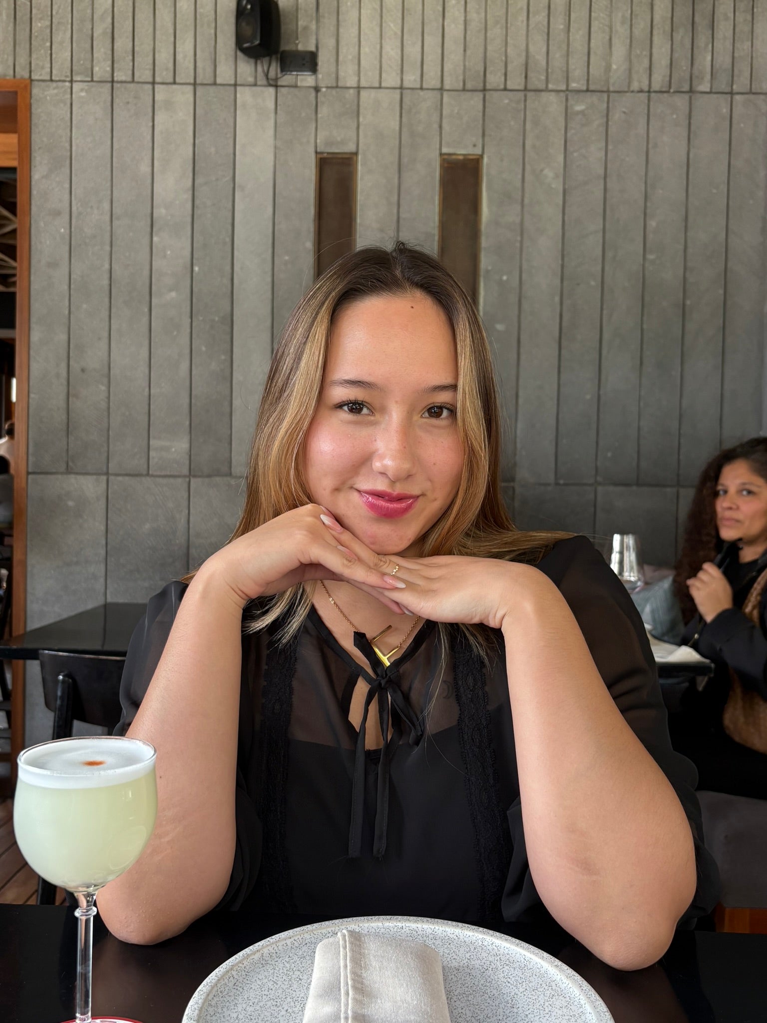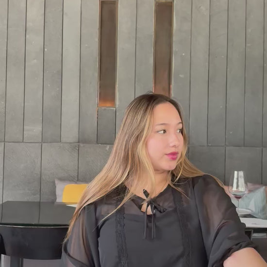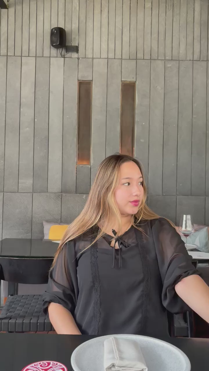 Blusa confeccionada en tela gaza y broderi delgada y transparente, con cuello redondo con amarre en la parte delantera, con mangas tres cuartos.