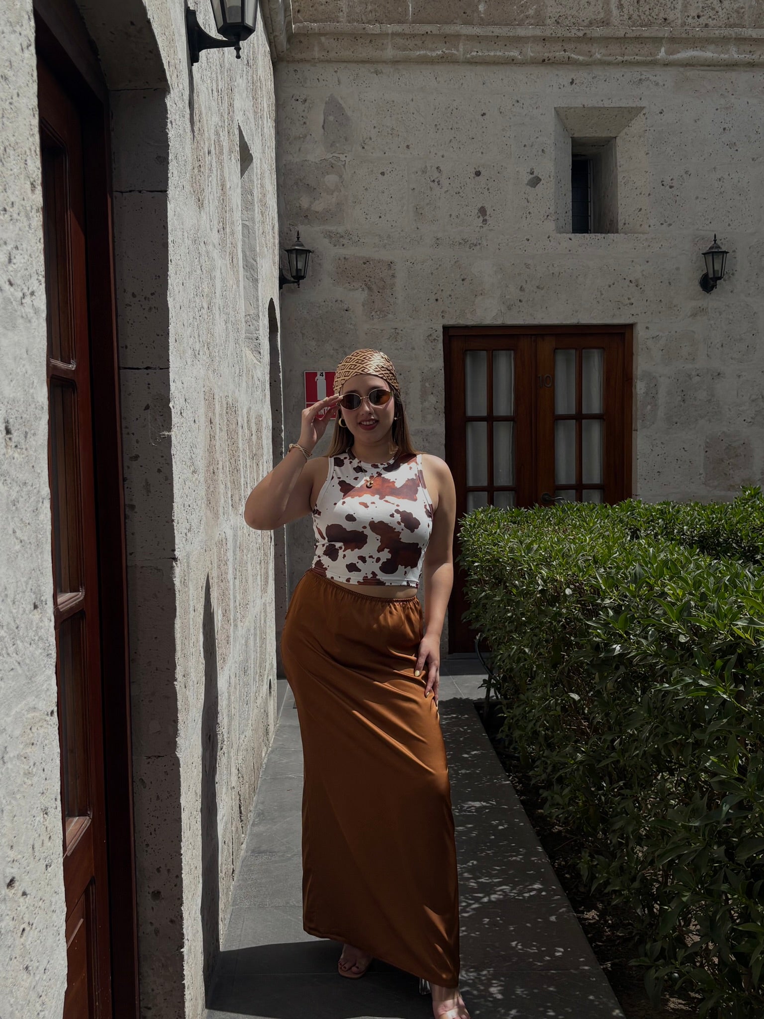 La modelo mide 1.61 cm y usa talla L.