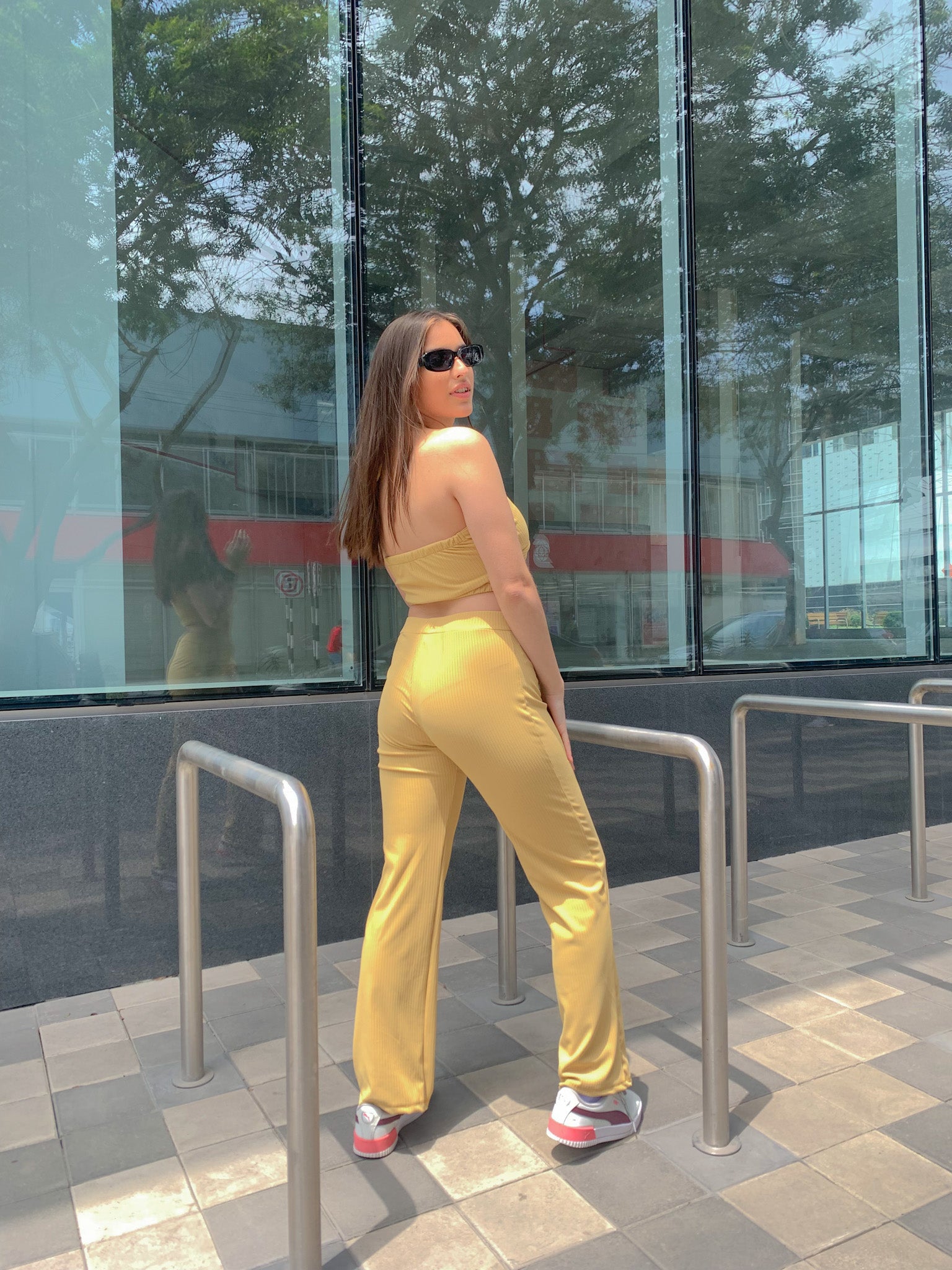 Elaborado en tela rib intermedio acanalado, pantalón recto con elástico a la cintura, no trasluce.